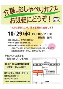 cafe20251029 2025.09.26 さくら・市民ネットワーク 開所時間:月〜金 10:00-17:00(平日)TEL:043-462-0618FAX:043-489-0797E-mail:news[at]sakura-siminnet.com〒285-0837 千葉県佐倉市王子台3丁目5-13