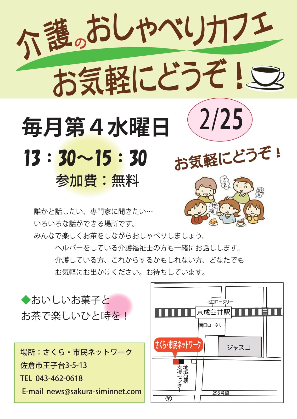 2/25(水)介護のおしゃべりカフェ 最新情報 2026.02.06 介護のおしゃべりカフェを2月25日(水)13:30~、さくら市民ネット事務所にて開催します。介護のおしゃべりカフェは毎月第4水曜日に開催しています。お茶を飲みながら、ゆっくり語らい合いませんか? どなたでもお気軽にご参加ください。 日時:2/25(水)13:30−15:30場所:さくら市民ネットワーク事務所