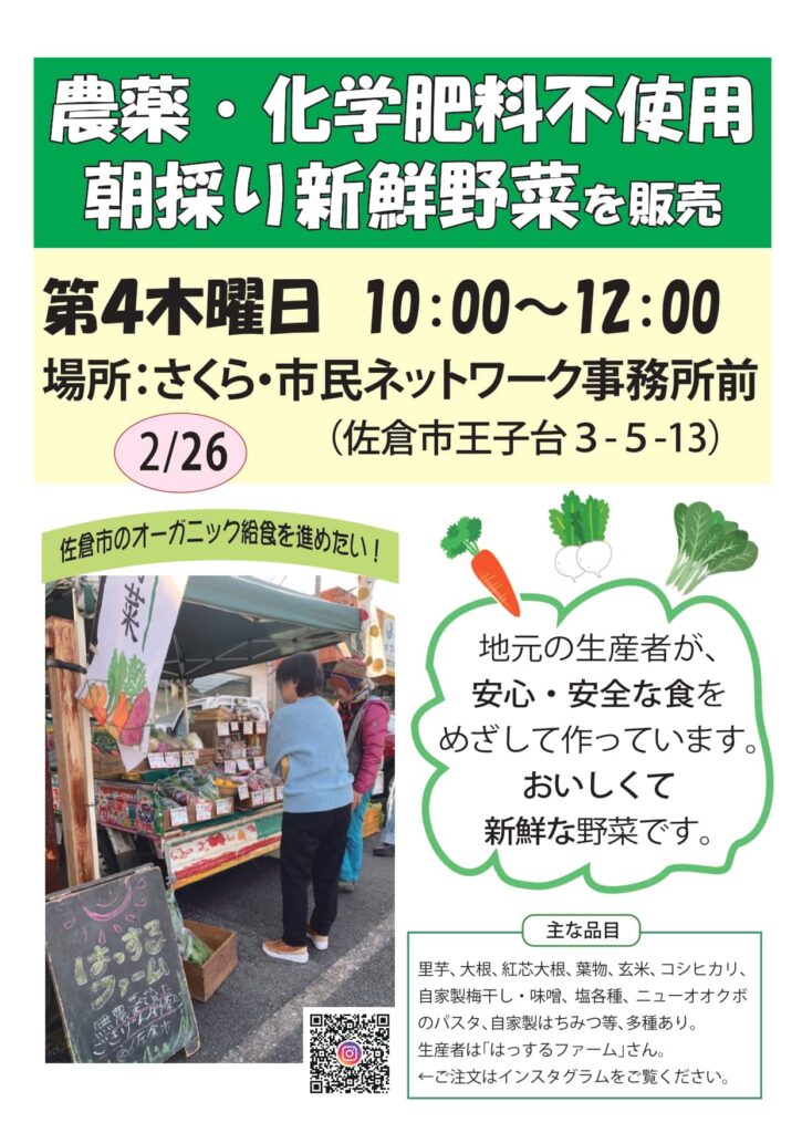 2/26(木)新鮮有機野菜を販売します(さくら・市民ネット事務所前にて) 最新情報 2026.02.06 佐倉市のオーガニック給食を進めたい! 農薬・化学肥料不使用の朝採り新鮮野菜を販売します! 地元の生産者が、安心・安全な食をめざして作っています。おいしくて新鮮な野菜です。 日時:2月26日(木)10:00~12:00場所:さくら・市民ネットワーク事務所前